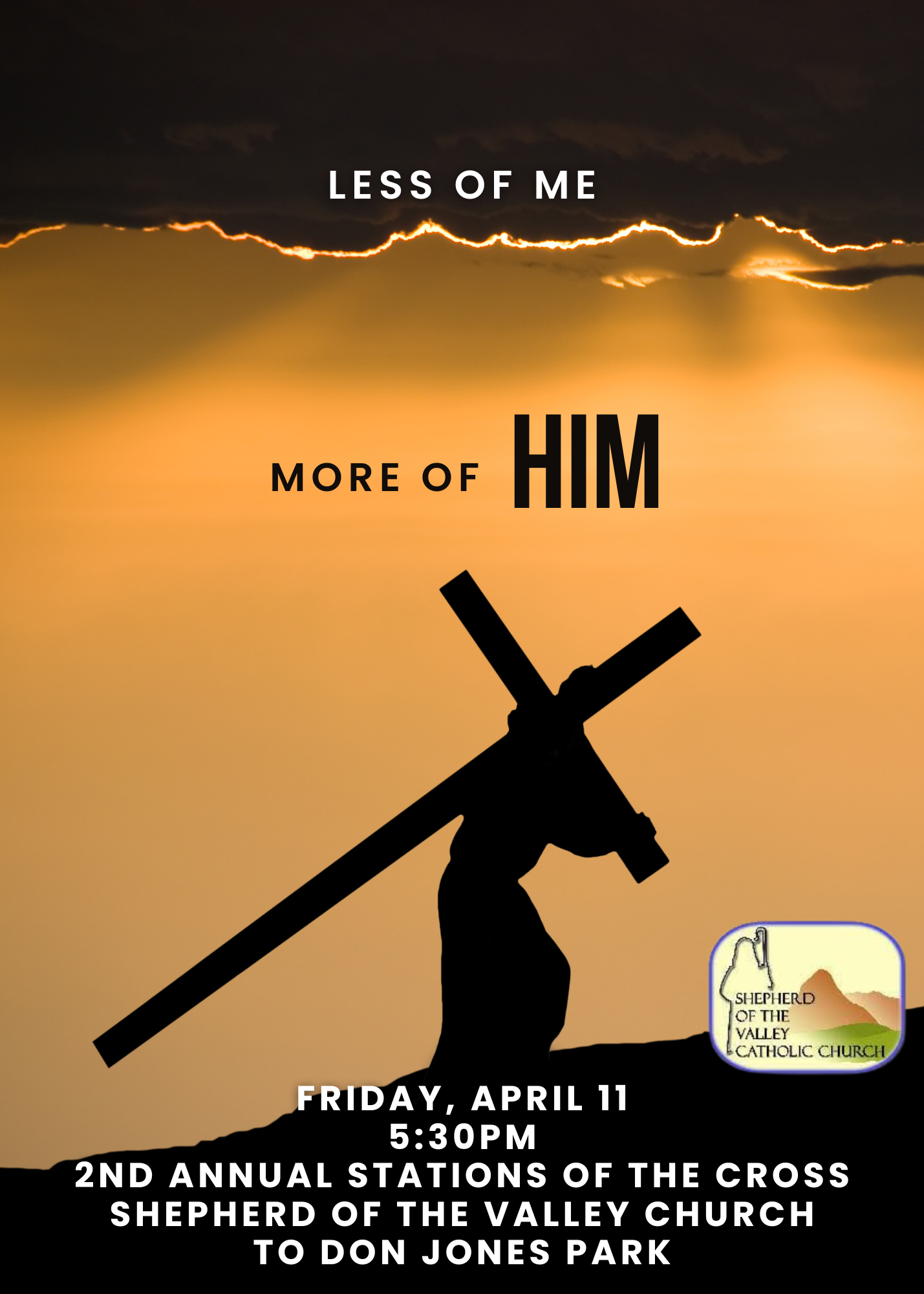 On Friday, April 11th we will have our 2nd Annual Stations of the Cross procession from Shepherd of the Valley to Don Jones Park.