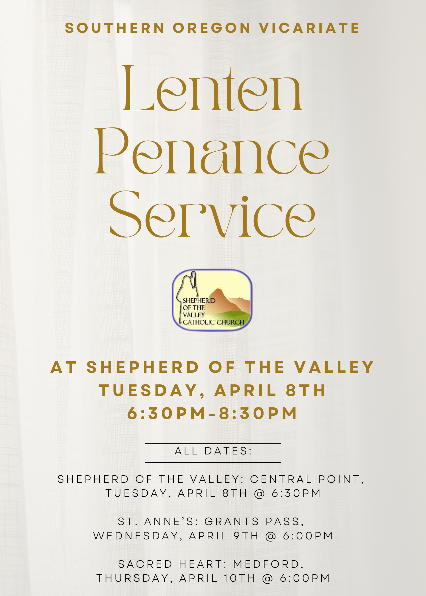 All are welcome to the 2025 Shepherd of the Valley Catholic Church Lenten Retreat, offered in Spanish & English. Please check in at the Parish Hall at 9am on Saturday, March 22nd. Childcare will be provided by volunteers.